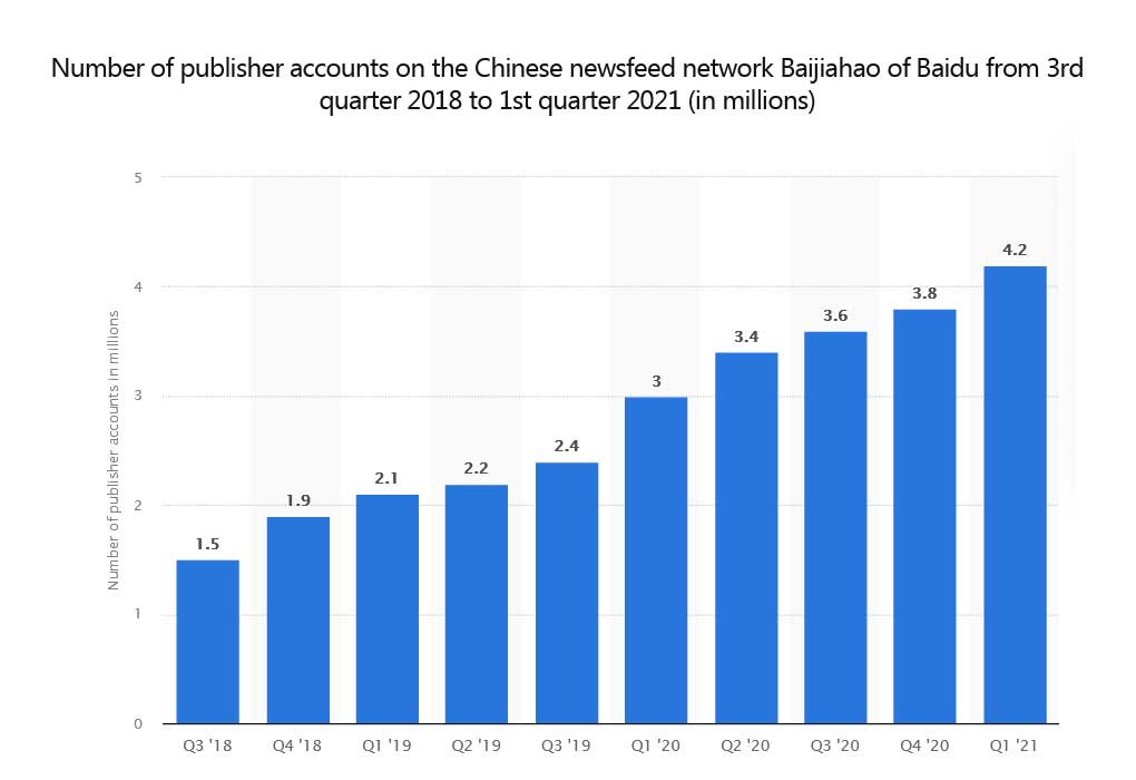 Baijiahao reached 4.2 million publishers with 42% growth year on year in 2021. Popular dominant media outlets on Baidu are People’s Daily, Xinhua News Agency, and CCTV which can direct user traffic towards newsfeeds or search results.