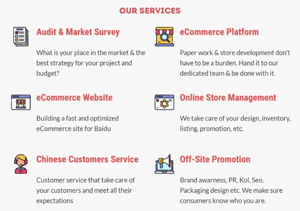 We are a China-based marketing agency offering cost-effective solutions to foreign brands interested in tapping into the Chinese eCommerce market. Our team of Chinese and foreign experts has the experience and know-how needed to succeed in this lucrative, yet complicated market.